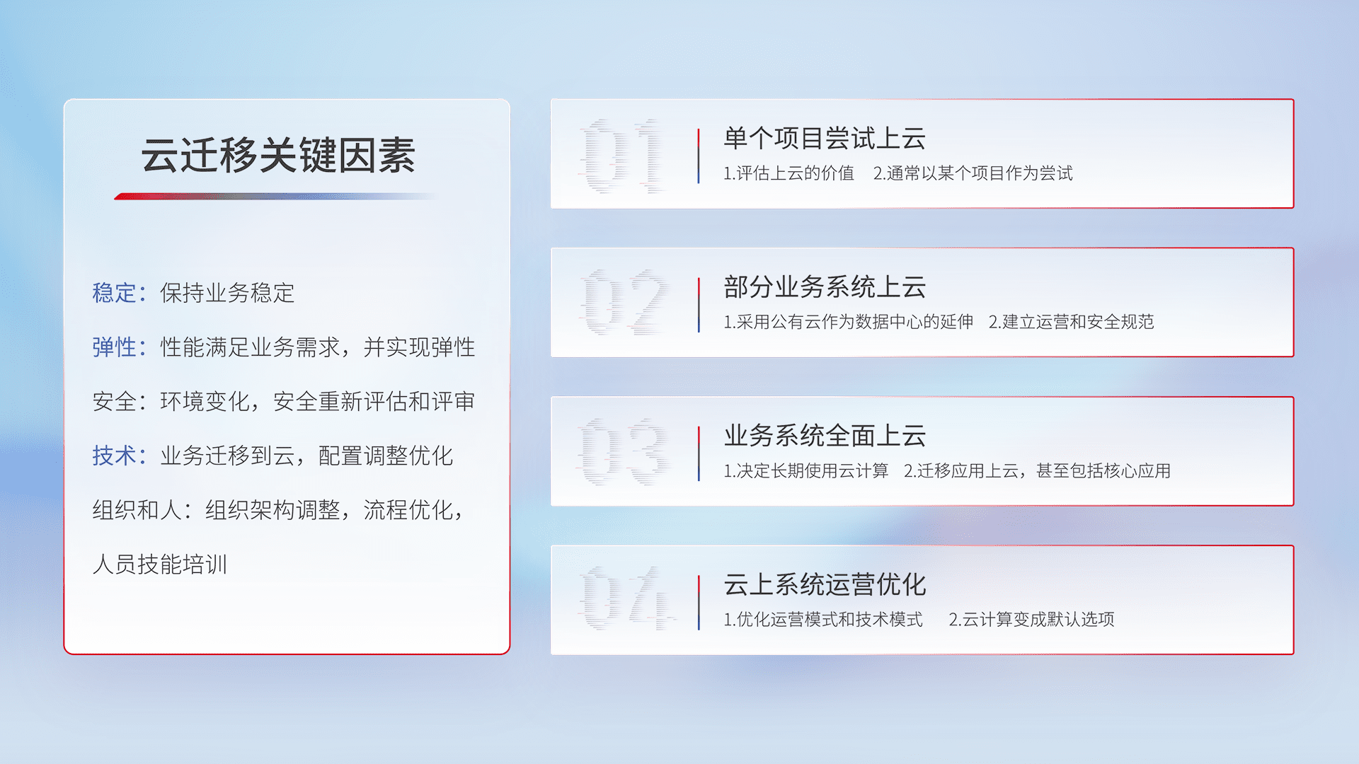 结合实际业务,,从规划设计、、云平台选型、、云原生改造、、、、数据迁移、、、集成交付,,,,迁移全过程为客户识别最佳上云路径,,,,做好风险识别管理,,,设计网络架构、、、身份权限、、、安全审计合规、、操作审计、、、、日志审计、、、监控告警策略、、、多站点容灾设计等,,对云上基础设施进行整体规划,,,,提升IT治理水平,,,,以满足弹性、、、高可用、、、、高性能的需求。。