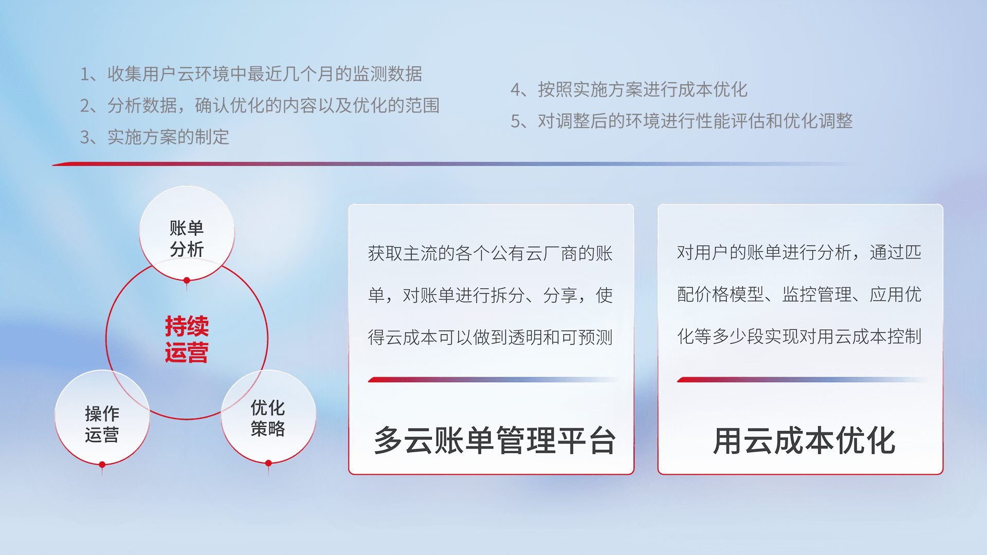 通过多云纳管,,以统一的资源数据模型把客户的云资源进行抽象和封装,,进而实现对多云资源的统一操作,,保障云资源管理的可靠性、、、、稳定性与可用性。。。量身定制化运维内容,,配置、、、、开发运维、、补丁管理、、备份、、监控、、、、认证和访问管理、、、审计和日常巡检等,,,,保障在用云过程中的可靠度,,,稳定度以及高可用率。。。。