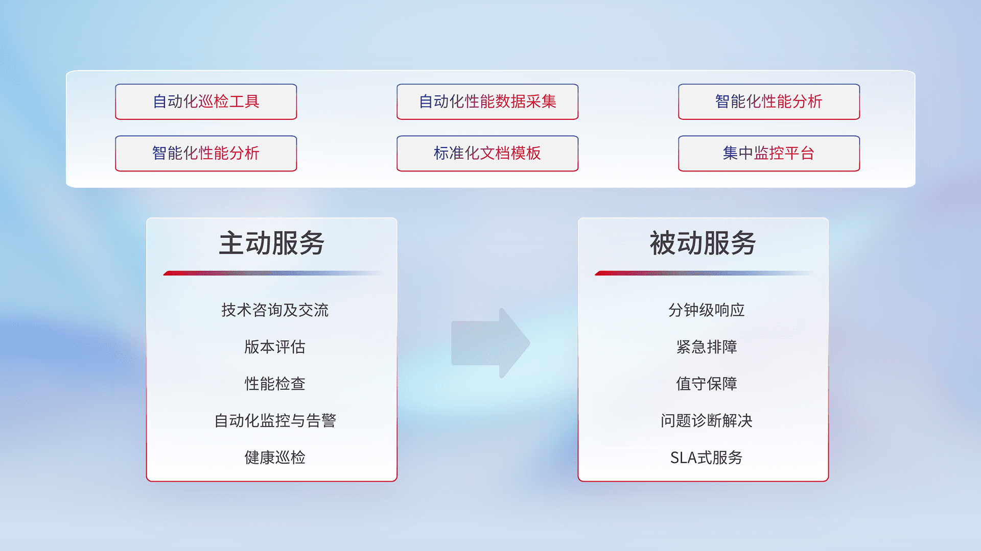 智能化工具和标准化文档,,,,保障服务质量,,,提供主动服务(包含技术咨询、、、版本评估、、、性能检查、、自动化监控与告警、、健康巡检)和被动服务包含(分钟级响应、、紧急排障、、、、值守保障、、、问题诊断解决、、、、SLA服务)。。。